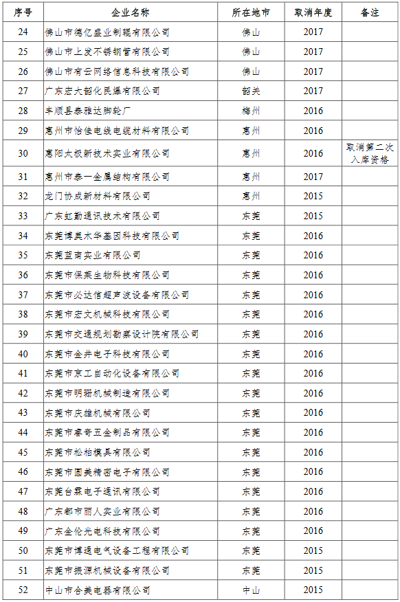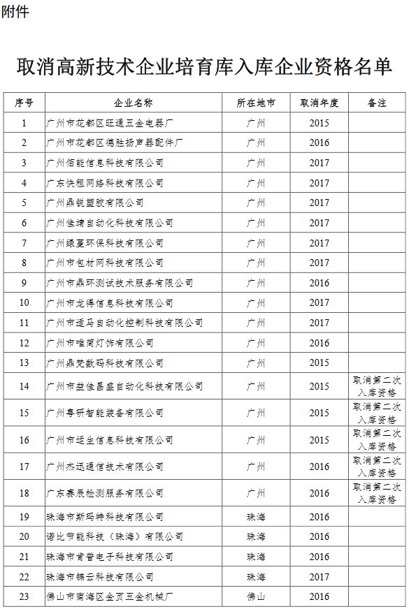 根據《廣東省20152017年度創新型企業培育政策落實及相關財政補助資金使用績效專項審計調查報告》(粵審教專報〔20193號)反饋意見,省科技廳在地市科技部門核查基礎上,對相關高新技術企業培育庫入庫企業的申報、評審、入庫、獎補等情況進行復核,經核實廣州市花都區旺通五金電器廠等59家企業不符合高新技術企業培育庫入庫要求、廣州市益佳昌盛自動化科技有限公司等6家企業重復入庫。根據《廣東省高新技術企業培育工作實施細則》(粵科函高字〔20161737號)有關規定,研究決定取消廣州市花都區旺通五金電器廠等59家企業的高新技術企業培育庫入庫企業資格,取消廣州市益佳昌盛自動化科技有限公司等6家企業的高新技術企業培育庫第二次入庫資格,相關財政資金收回按有關規定辦理。