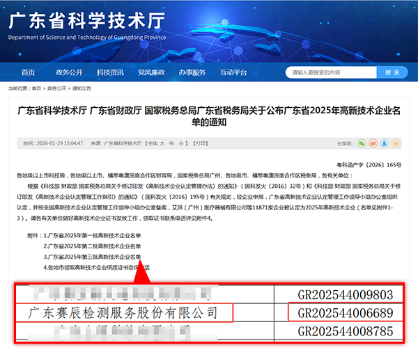 近日廣東省科學(xué)技術(shù)廳 廣東省財(cái)政廳 國(guó)家稅務(wù)總局廣東省稅務(wù)局關(guān)于公布廣東省2025年高新技術(shù)企業(yè)名單的通知,賽辰檢測(cè)憑借卓越的技術(shù)創(chuàng)新能力和扎實(shí)的研發(fā)實(shí)力,再次榮獲"高新技術(shù)企業(yè)"稱號(hào)。